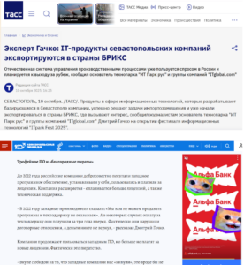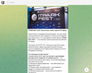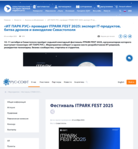 ITPARK FEST — ежегодный технологический фестиваль в Севастополе, который проводит технопарк «ИТ ПАРК РУС». В 2025 году событие прошло в седьмой раз и стало площадкой для разработчиков, стартапов, бизнеса, студентов и отраслевых экспертов. Центральной темой стала дистрибуция и экспорт российских ИТ-продуктов, а также развитие технологического предпринимательства.